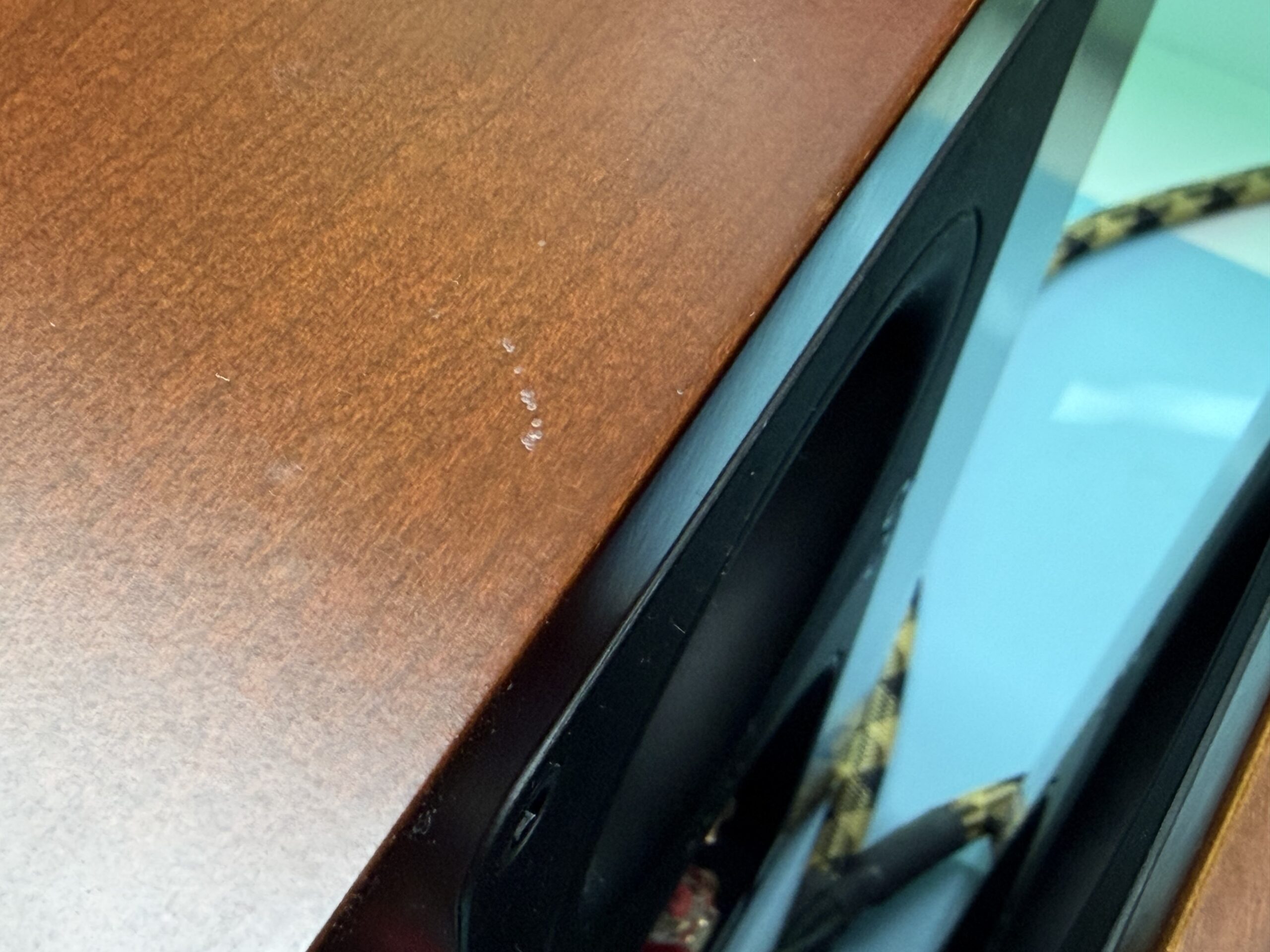 Eine Box hat an der Unterkante eine kleine Stoßstelle. Ansonsten nur sehr unauffällige kleine Kratzer und Wischspuren.