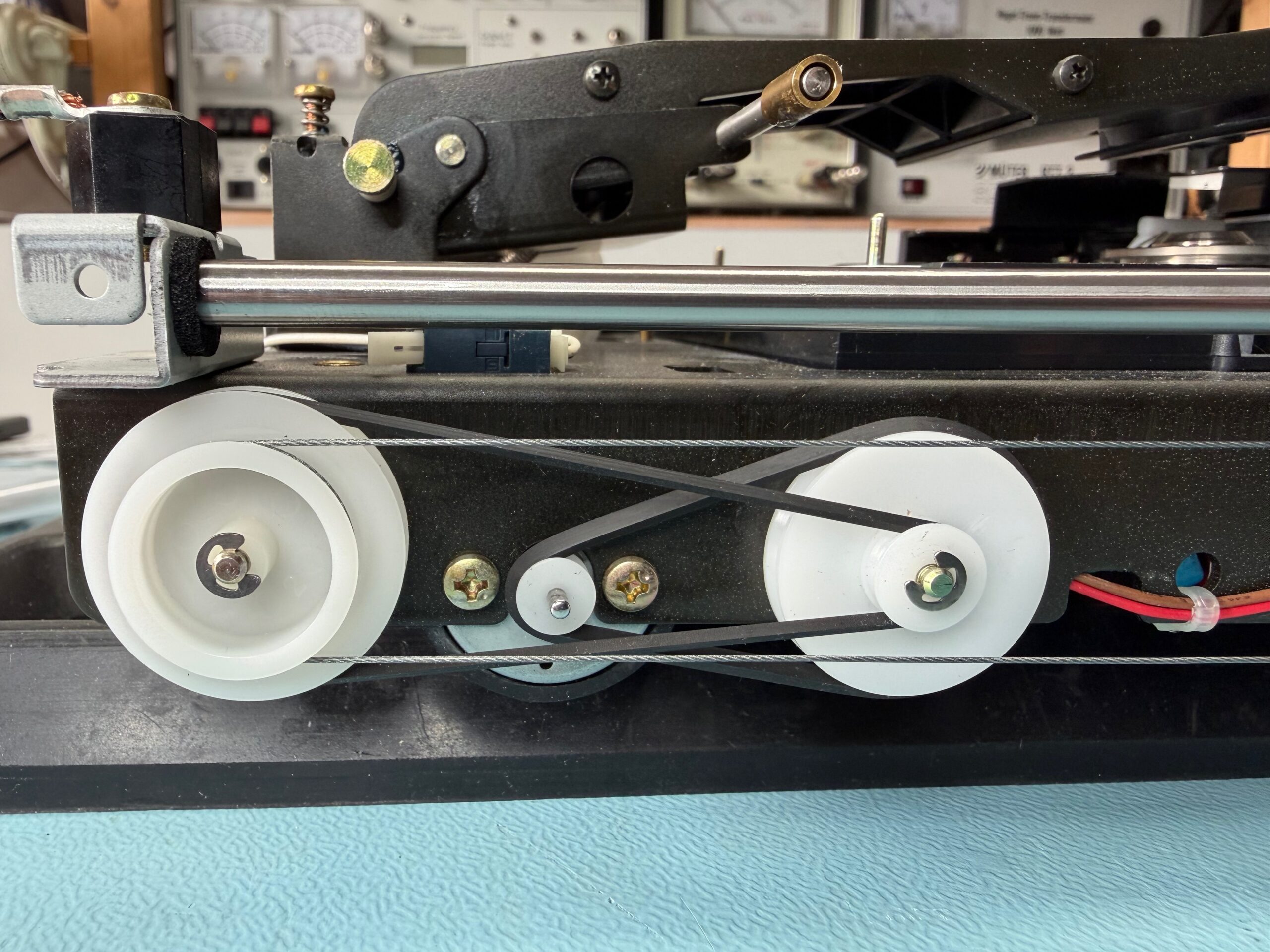Alle Funktionen einwandfrei. In der Mechanik wurden alle vier Riemen erneuert. Dabei wurden die komplette Mechanik ausgebaut. Nur durch den Ausbau ist es möglich die klebrigen Reste der alten zersetzten Gummiriemen komplett zu entfernen. Zudem wurden die beiden aufgelösten Schaumstoff-Dämper an der Stange für die Schubladenführung erneuert. Die Stange und die Lager der Stange wurden gereinigt und vorsichtig neu geölt.